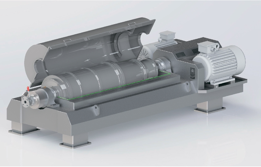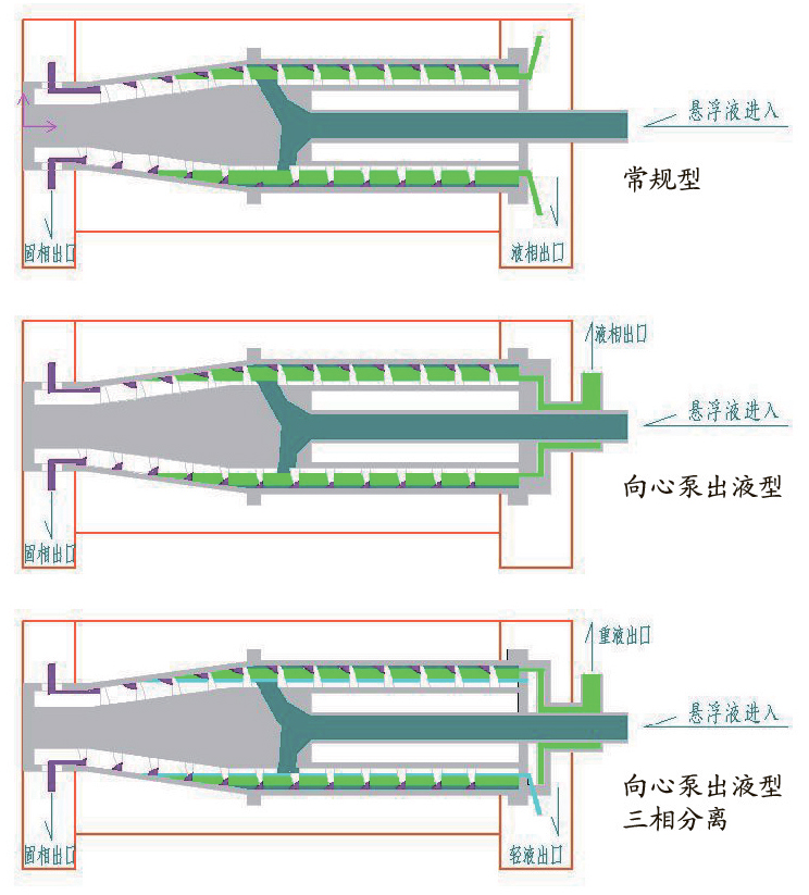 懸浮液通過進(jìn)料管進(jìn)入轉(zhuǎn)鼓內(nèi),在離心力場作用下密度較大的固相沉降至轉(zhuǎn)鼓壁上,固相在螺旋的推動(dòng)下從沉降區(qū)至干燥區(qū)后從出渣口排出;澄清的液相從轉(zhuǎn)鼓大端溢流口溢出,實(shí)現(xiàn)固液分離。